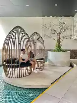 The Day Bed area has a birdcage hanging above. I am not sure what they mean. The air conditioning system and TV are controlled by a tablet. Amenities, shampoo, lotion, and body wash are from the Balmain brand.
