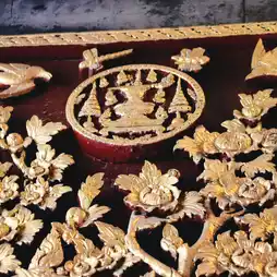 🪷The ordination hall has a pediment decorated with swans. When you enter the ordination hall, you will see large round pillars supporting the upper part, directing your eyes to the large principal Buddha image in the Mara-Vijaya posture in the Ayutthaya art style. It is a stucco Buddha image covered in gold leaf in the Mara-Vijaya posture in the U Thong art style. It is 2.60 meters wide and 3.50 meters high. On the door, there is a royal seal. On one side is an image of King Mongkut, and on the other side is an image of King Pinklao.
