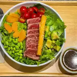 Salad Mixed organic green vegetables, tuna, avocado, peas, cherry tomatoes, mandarin oranges and sesame