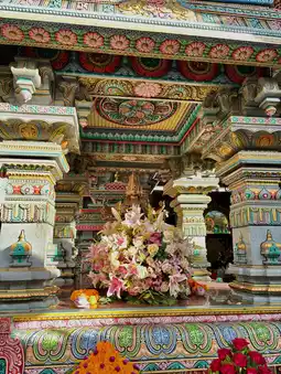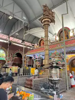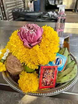 Today, we will take you to worship at Wat Phra Sri Maha Uma Devi or many people know it as "Wat Khaek" in Silom area. There are 2 entrances. First, when you enter, you must take off your shoes, do not bring food in, and wear a mask because this place is still strict about wearing masks. You can buy offerings inside. Bring the offering tray to offer inside. You will meet 2 Brahmins who will anoint your forehead with red. It is said that if anyone sincerely prays with faith, their wishes will often come true.