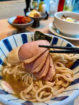 #Cafe Review Famous fresh ramen noodles from Kobe 🎌 Guaranteed deliciousness with the Michelin Bib Gourmand award. The homemade noodles are soft and chewy with a light brown color.