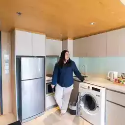 🍲 A small kitchen, refrigerator, microwave and electric stove, plates, bowls, spoons, and a washing machine in the room. It is very suitable for those who come to do business for several days.