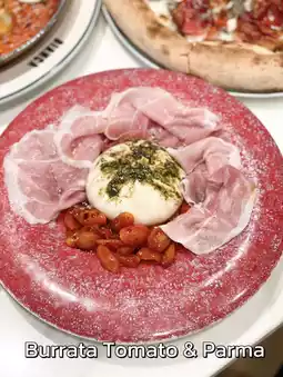 This is oozing Burrata cheese, eaten with Parma ham and tomatoes. It goes together really well.