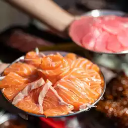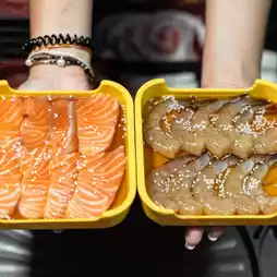 Salmon sashimi, pickled salmon, pickled shrimp, Australian brisket