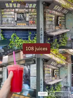 📌108 Juices, a juice shop hidden in an old building. The shop front looks classic, making it a check-in photo spot. In addition to taking beautiful photos, their drinks are also good. The photo corners here look like they came out of Pinterest. Open: Tuesday-Sunday from 12:00 p.m. to 6:00 p.m. (Closed on Mondays) Budget: 60-100 baht