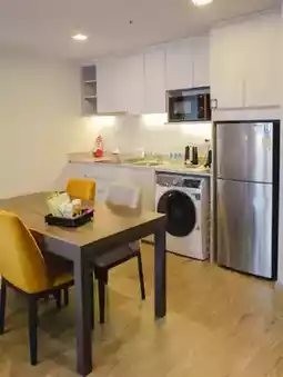 The room is very spacious with a complete kitchen, dining room, living room and work desk.