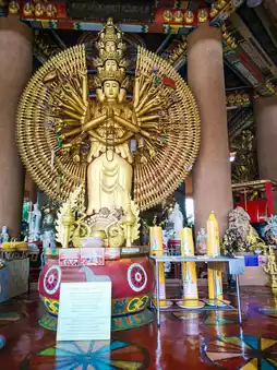 Travel Dlux takes you to see Chinese architecture at the Guan Yin Shrine, Chok Chai 4, located on Chok Chai 4 Road, Lat Phrao District, Bangkok. It is a sacred place that is important for those who respect Guan Yin. Inside the palace, there is the enshrined “Guan Yin with a Thousand Eyes and Thousand Arms” or “Avalokitesvara Bodhisattva”, which is a symbol of compassion and kindness. There are also 10,000 small Buddha statues.