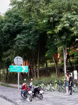 As for here, we consider the area to be quite spacious. It is a green area in the middle of the city, full of lawns and shade from large trees, next to Banthat Thong Road, with many restaurants to choose from on both sides.
