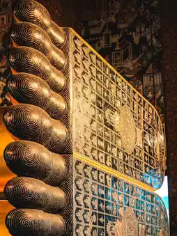 1. Reclining Buddha: The reclining Buddha at Wat Pho is a reclining Buddha image measuring 46 meters long and 15 meters high. The Buddha image is made of plastered brick covered with gold leaf and has beautiful details, especially the soles of the reclining Buddha's feet, which are decorated with 108 auspicious symbols.