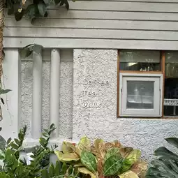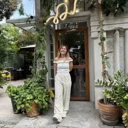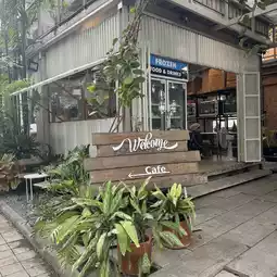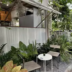 The cafe is set in a renovated old wooden house with an outdoor seating area under large shady trees, creating a serene and peaceful environment. It’s perfect for relaxing and enjoying conversations on a leisurely day.