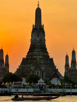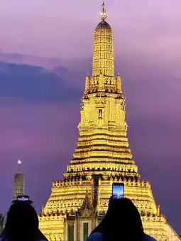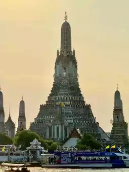 Today, we present a travel destination in Bangkok that is incredibly photogenic: Wat Arun. We visited in the evening, positioning ourselves across from the temple to capture it during sunset and after the sun had set. Let me tell you, it was stunning. This day trip was truly heartfelt. Each photo we took had a unique and vibrant feel. Inside, there's also a service for dressing up in traditional Thai outfits for photos, if I remember correctly, it costs 200 baht.