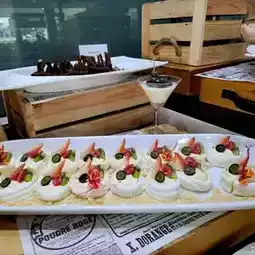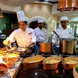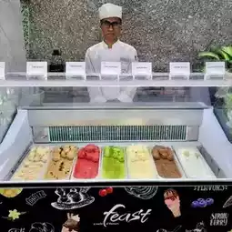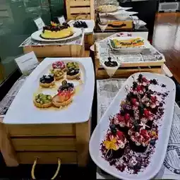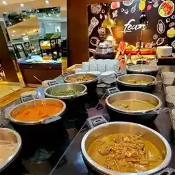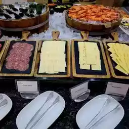 Feast restaurant, Royal Orchid Sheraton Hotel, is located on the 1st floor of the hotel. It is one of the main restaurants that is spacious and comfortable. You can clearly see the Chao Phraya River. The buffet here starts from noon 12:00 noon until 14:30. The buffet includes drinking water and there is a special drink for 1 more person. The highlight of the buffet here is the seafood on ice, which comes with sweet shrimp, New Zealand mussels, fresh squid, as well as sashimi with salmon and sea bass. In addition, there are Western dishes such as sea bass steak, lamb shank, and freshly made pasta. As for cheese, there are many types to choose from, including cold cuts. There is also an Indian menu with roti dough. There are also Thai dishes, various soups, especially the truffle mushroom soup, which is very rich and delicious. As for desserts, there are many cakes to choose from, fruit tarts, various fresh fruits, homemade ice cream with unlimited toppings. You can come and enjoy delicious food every Saturday at the Royal Orchid Sheraton Hotel, Si Phraya Pier.