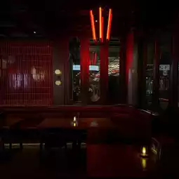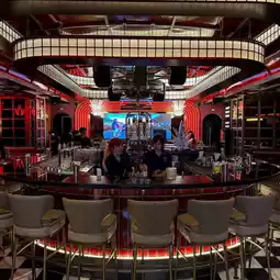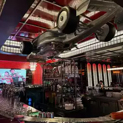 The interior of the shop is decorated in red, contrasting with the black and white checkerboard pattern that we often see on racing flags. 🏁🛑 The lighting, the placement of the bar in the middle and the F1 car on top, it all goes together.