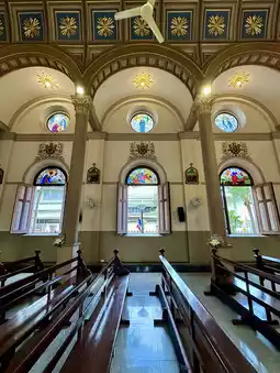 ⛪️ The interior of the church is not as sweet as the outside, but it is secretly luxurious with chandeliers, stained glass windows, and murals telling the history of Christianity.
