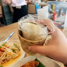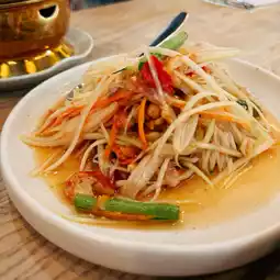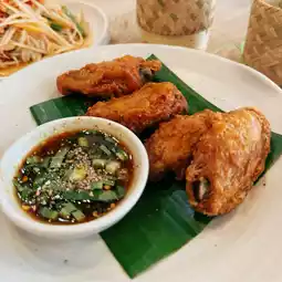Papaya salad and fried chicken wings: These two dishes are served together and come with sticky rice. Papaya salad tastes very refreshing, with the right balance of sweet and sour.