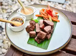 #tripflyingtravelasia Cafe and restaurant & bar in one place, complete with chill atmosphere under the trees, with a photo corner, cool air-conditioned room. IVORY Coast Almond - Homemade Café & Dining Recommended dishes to try include grilled beef tongue, spaghetti with pink sauce, shrimp eggs, lobster, red grouper, tempura with morning glory, Caesar salad, tiger prawns, garlic fried rice, Hanger, Pad Thai with fresh shrimp, Pad Thai with grilled river prawns, cold noodles with ponzu sauce, cold noodles with soba, Hiyashi ChakPork Chashu Ramen, dumplings, noodles, dumplings, dumpling soup, boiled dumplings