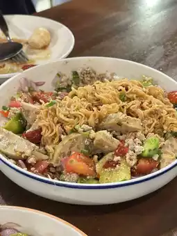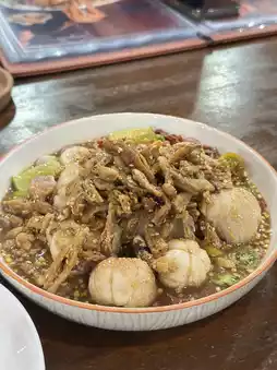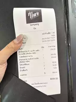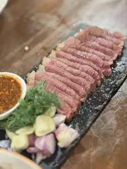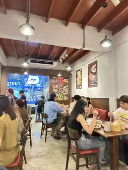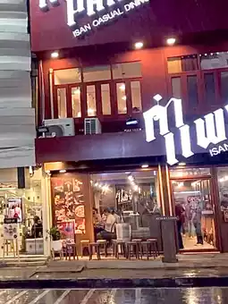 Khampaeng Restaurant, a popular Isan restaurant in the Banthat Thong area. The atmosphere of the restaurant is decorated in a red wooden style. The atmosphere is like eating at home. There are 2 floors in total. All the food is a fusion of Isan food with non-local ingredients. - First dish, Mangosteen salad, mixed with fermented fish, shrimp paste, tamarind juice, ripe mangosteen, very delicious, 10/10, price 299฿ (eat a lot, it's a bit greasy) - Second dish, grilled sirloin, cooked medium rare, very soft, very delicious, 10/10, price 379฿ - Spicy minced pork salad with instant noodles, crunchy noodles but a bit sour, 7/10, price 229฿ When we went, it was already late at night, no need to wait in line, there was just 1 table available. If you go during the day, you may have to wait in line. The price is a bit high. If you want to try it once, I recommend this restaurant. It's really great.