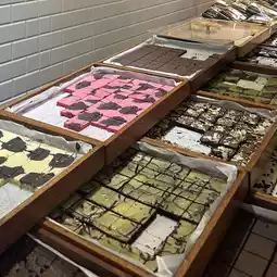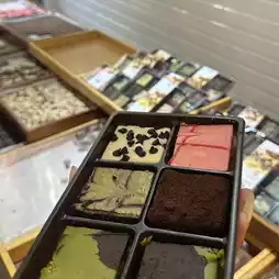 Another shop is a dessert shop. A famous brownie shop called Baan Toaob has many flavors of brownies to choose from. I think the green tea is the most delicious. There are many flavors of macarons that are cheap. There are also other types of bread.