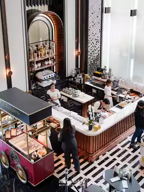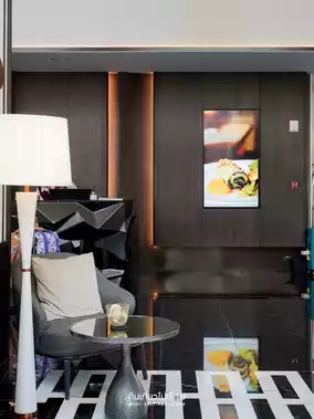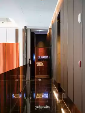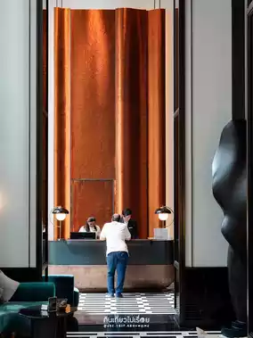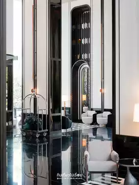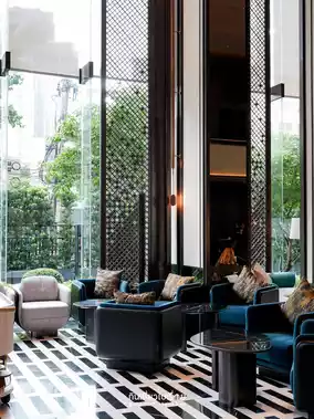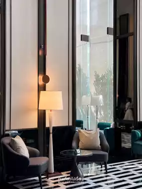 The whole area is the hotel's lobby. It's decorated luxuriously with high ceilings, modern lamps and furniture, matching the central area of Bangkok.