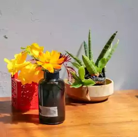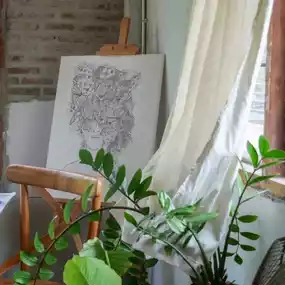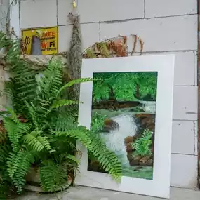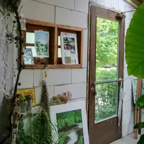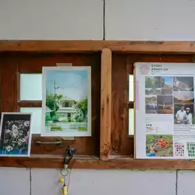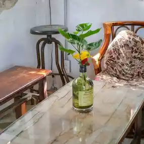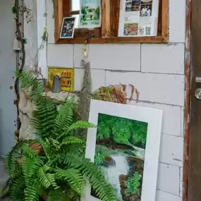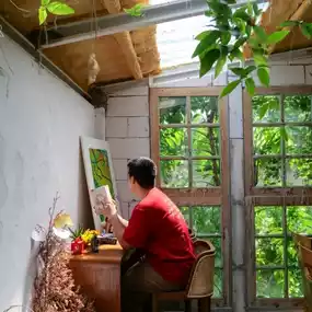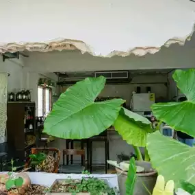 The cafe stands out with an old white house that has been renovated into a cafe, maintaining the raw look of the cement surface and the design of the windows that allow natural light to enter, creating a warm atmosphere. It is also decorated with artwork and large and small trees that are scattered and decorated throughout the shop, giving the feeling of being transported into the Enchanted Forest.