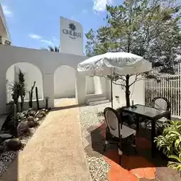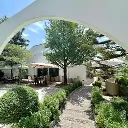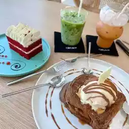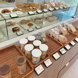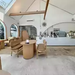 A minimalistic cafe decorated with white and wood tones, giving a warm and clean look. There's a small pool and an archway for ladies to take beautiful photos. This cafe is located in the Romklao area, right by the road, making it very convenient to get to. It opens in the morning, and you can order drinks and take photos. There are both indoor and outdoor seating areas with a pleasant atmosphere. The cafe offers a variety of croissants and cakes.