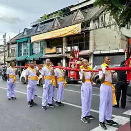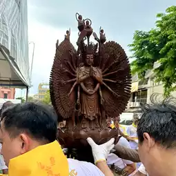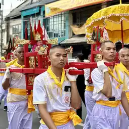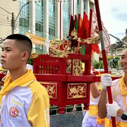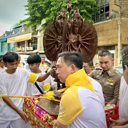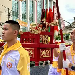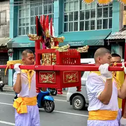 🍂 At 16.00, there is a ceremony to start the festival that shows the general public of the Yaowarat Vegetarian Festival in Bangkok by inviting the gods "Kiu Ong, Hok Chow, Tao Bo Nia, Nam Sing, Pak Tao Cha Kung" on a palanquin, led by a lion dance troupe, ending with "The Thousand-Handed Bodhisattva Guan Yin" from Wat Lokanukroh to be enshrined at the Chaloem Phrakiat Arch, Yaowarat. The procession is full of faith, determination, excitement, and fun. With the cooperation of 22 shrines in the Yaowarat area, they came to join the ceremony for people to come and pay homage and ask for blessings.