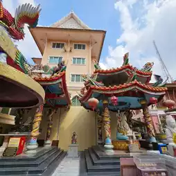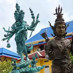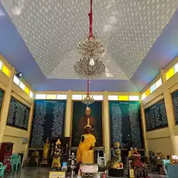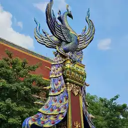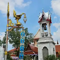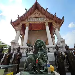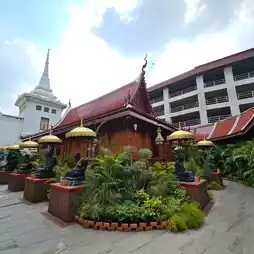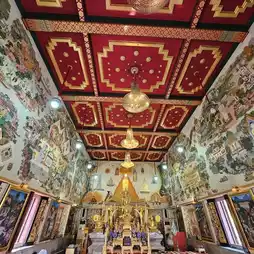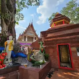 Originally named Wat Bang Khun Phrom Nok after the district, King Rama I granted the land for the settlement of Vientiane families. Later, Chao In, the uncle of Chao Noi Khiao Khom, a royal consort of King Rama I, renovated the temple and named it Wat Intharam. Monks from Vientiane, who were former teachers of Somdet Phra Phutthachan (To), were invited to govern the temple. During the reign of King Rama VI, it was renamed Wat Intharavihan to avoid confusion with Wat Intharam in Bang Yi Ruea. The temple is located on Wisut Kasat Road. If walking, you can enter through Soi Samsen 10. If driving, turn left onto Wisut Kasat Road, and you will see the temple gate on the left. Inside, there is a parking building. On the right, you will see the main ordination hall in Ayutthaya style with a curved base like a ship, adorned with chofah, bai raka, and hang hong. The gable features a depiction of Narayana riding Garuda, facing east. There are boundary markers on a high base in eight directions. The principal Buddha image is Luang Pho In, in the Mara Vichaya posture. Inside, there are murals depicting the history of Somdet Phra Phutthachan (To). Behind the ordination hall, there is a white Lanka-style stupa and two white prangs. There are also statues of King Taksin and King Rama V.