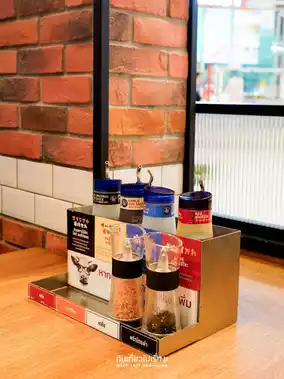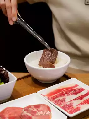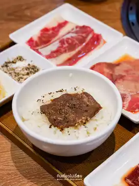 The grill here heats up very quickly, and the meat barely sticks to the grill. We ordered a set of Brother Cow's Examination, refillable for 2 people, for 499 baht. You can choose 6 dishes of beef or pork. I recommend ordering beef because it's very good. The beef tongue is also better than expected. You can refill rice, soup, and salad as much as you want. Eat it with the restaurant's dipping sauce. We like every flavor.
