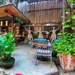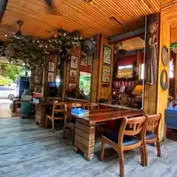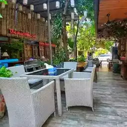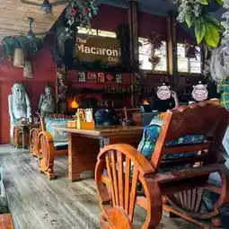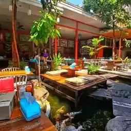 The Macaroni Club is an open-air restaurant decorated in a Thai style with bamboo, wooden tables, a beautiful koi pond, and decorated with statues and trees, giving a natural feel in the middle of the city.