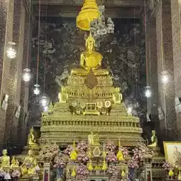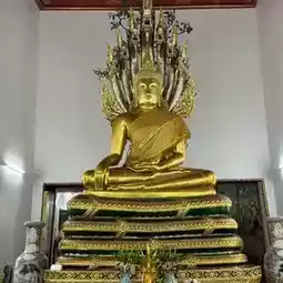 Today, we will introduce a beautiful and sacred temple, one of the famous temples in Bangkok. It is easily accessible by taking the MRT or subway to the National Museum Station and then walking for another 2-3 minutes to reach the temple. Inside the temple, there are famous architectural structures such as the Reclining Buddha. However, in this post, we will take you to see the marble stupa and the principal Buddha image in the meditation posture, which is magnificent and worthy of reverence. Additionally, there is the Buddha image in the Naga Prok posture, which is suitable for those born on Saturday. We highly recommend visiting this temple. Nearby, there are Wat Phra Kaew and the City Pillar Shrine, which are must-visit places when traveling to Bangkok.