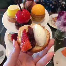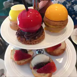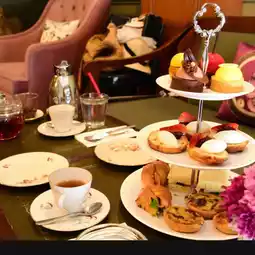 An afternoon tea set for two, including two types of sandwiches, quiche and scones, four signature mini cakes, and a teapot, priced at 1200THB per set (for two people)