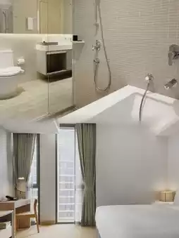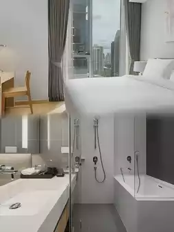 The room I stayed in was very spacious, with a huge, soft bed that made it hard to get up 💤. It was equipped with modern amenities, including a separate bathtub and shower, perfect for relaxation. The view from the window was breathtaking, with the Bangkok skyline at dawn!