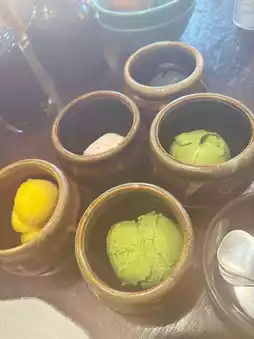 ✨Homemade ice cream served in a small jar with a variety of flavors. Japanese rice milk, charcoal, green tea, mango, plum