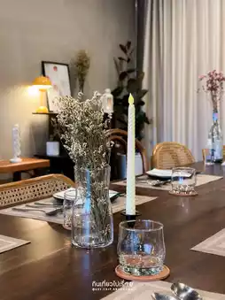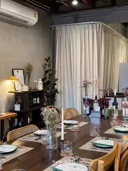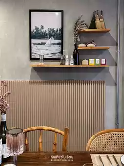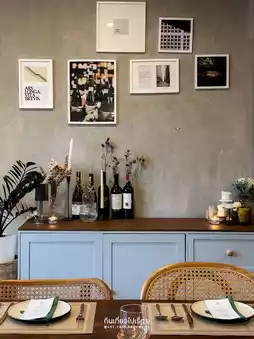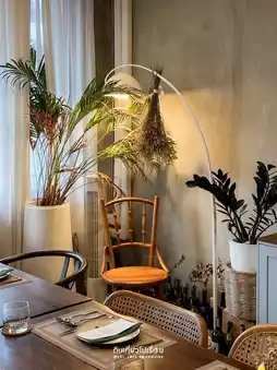 Climb the stairs to the third floor and open the curtains. The restaurant's decor is incredibly minimalist and soothing. Even though it's not very spacious, the furniture is well-arranged. And the decor is great, with picture frames, potted plants, chairs, and shelves, making it feel like home.
