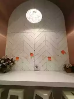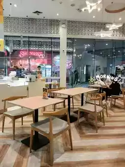 The interior of KANOM is beautifully decorated with beautiful lamps and glass walls, making the shop look spacious, airy, and comfortable. It is clean and has tables and chairs to accommodate customers.