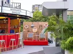 Holli Bolli Rooftop - Beach Theater themed bar is located on the 8th floor of Radisson Suites Hotel, Sukhumvit Soi 13, just 600 meters from BTS Nana. This bar takes you away from the hustle and bustle of Bangkok to a chill beach atmosphere. With a Beach Bar style decoration that will make you feel like you are relaxing on the beach.