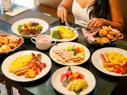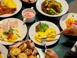 🍳In the morning, breakfast is served as a buffet. The breakfast line is very full.