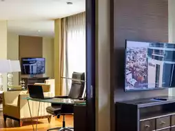 •The living room area has a sofa, a work desk, a large TV, and 1 bathroom.