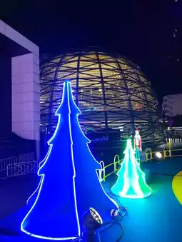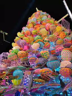 🌲See the Christmas Power tree. It's started today. This year, they're going all out as usual. They're using Thai-style fans made from woven machinery from Thailand to make colorful Christmas trees. How did they come up with this idea? It's so creative. The gift boxes are tied with sarongs. There's also a beautiful photo booth. The stage has a Christmas tree as a backdrop. It's so pretty and has plenty of photo spots. Don't forget to take some photos.