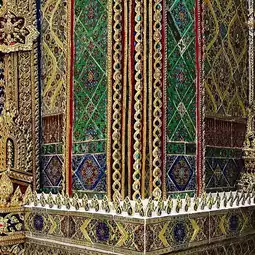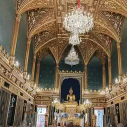 The intricate details of the ordination hall immediately drew my attention. The exterior features finely carved gables and delicate floral motifs, while the interior boasts stunning murals that depict celestial themes and Buddhist teachings. The artwork reflects King Rama IV’s deep interest in astronomy and blends spiritual symbolism with a sense of cosmic wonder. The centerpiece, a golden Buddha seated in serene meditation, exudes a quiet yet commanding presence, perfectly complementing the tranquil atmosphere of the temple.