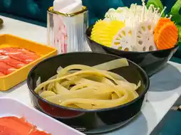 Served with fresh vegetables, Taiwanese tofu, long white sweet potato noodles, and organic eggs. There is also a dessert, Gui Ling Gao or almond pudding.