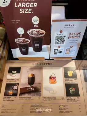 #tripพาบินเที่ยวจีน Surya Café is a cozy coffee shop in front of Sammakorn Village. It is simply but stylishly decorated in black tones and comes with the aroma of coffee, inviting you to stop by and relax.