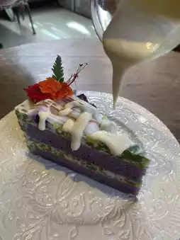 Today, we chose to eat Lod Chong cake and iced latte (coffee is about 100 baht per cup). The price is okay for a cafe in the city like this. But the highlight of this place for us is the festival theme decoration, suitable for content creators and people who like taking pictures.