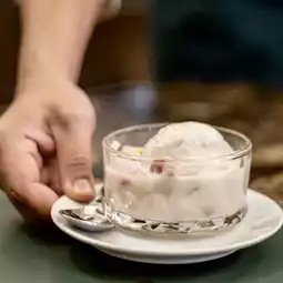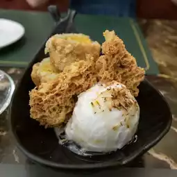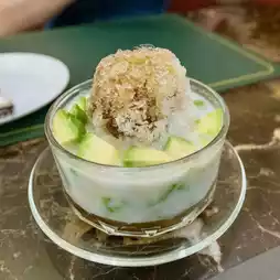 - Then finish with a delicious dessert, "Fried Rice Cake Ice Cream", eaten with coconut milk ice cream, sprinkled with roasted coconut. It smells so good and is so refreshing. And the “Avocado in Coconut Milk with Coconut Flower Syrup” tastes so sweet, creamy, and well-balanced.