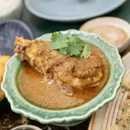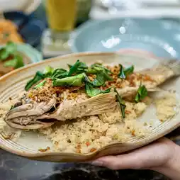 - For those who like catfish balls, the green curry menu here is made with thick and soft catfish balls, well-rounded flavor, delicious. You can eat it alternately with the fried fish menu that we ordered, "Fried Sea Bass with Turmeric and Crispy Lemongrass", fragrant with herbs. If we come again, we will definitely order it again. For snacks, we recommend "Fried Shrimp Cakes", eaten with plum sauce, very enjoyable.