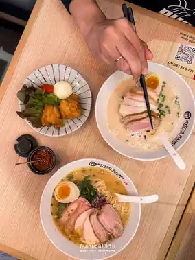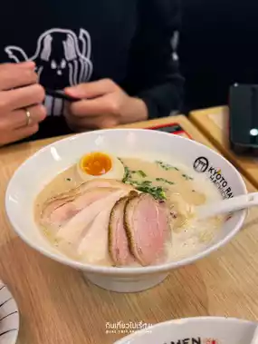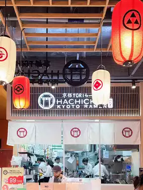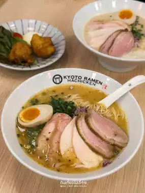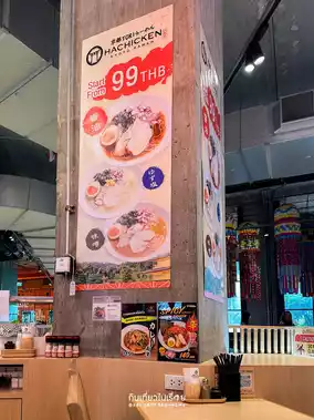 #triptravelchina Hachicken Kyoto Ramen on the M floor of Emsphere is a ramen shop that combines Japanese and modern styles, looking a bit youthful. The shop is not very big, with about 10-12 tables. The menu is not very extensive, but the prices are quite good, starting at 99 baht. It focuses on chicken ramen and duck chashu, chicken chashu rice, and some snacks, such as chicken karaage.