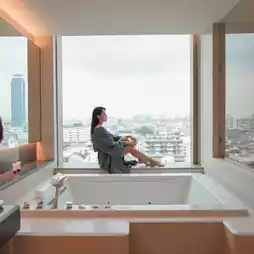 🏨 The hotel is located in the heart of Surawong area, another central location of the economic area, tourist attractions, shopping malls, very convenient to travel near expressways, electric trains, ports, complete facilities, Spa, Fitness, Play Room, restaurant, rooftop swimming pool, city view that can see the Chao Phraya River and ICONSIAM and this hotel is also an important fireworks viewing point of various festivals. The view here is very beautiful.