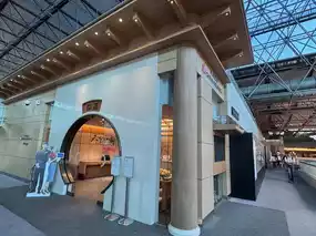 There are a lot of seats downstairs. They sell food and drinks, have plugs for charging, and also have luggage storage. It's really complete.