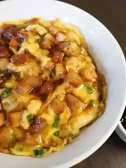 There is a menu of thick egg rice with various toppings, whether plain or with diced roast pork on top of rice. Eat with Sichuan chili sauce, it's awesome.
