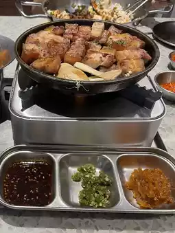 We ordered a tempting Korean barbecue set meal, accompanied by fragrant white rice. Although the barbecued meat here is cooked in a unique way using a barbecue iron pan instead of the traditional barbecue method, the tenderness and flavor of the pork are very charming and memorable. In addition, we also tasted an authentic pilaf that truly captured the essence of Korean flavor.